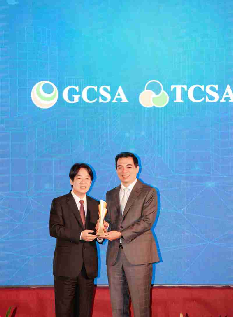 达全方位永续表现获全球永续奖及台湾永续奖肯定,,,,由副总统赖清德颁奖 (左),,,,开云电子总经理柯富仁 (右) 代表领奖