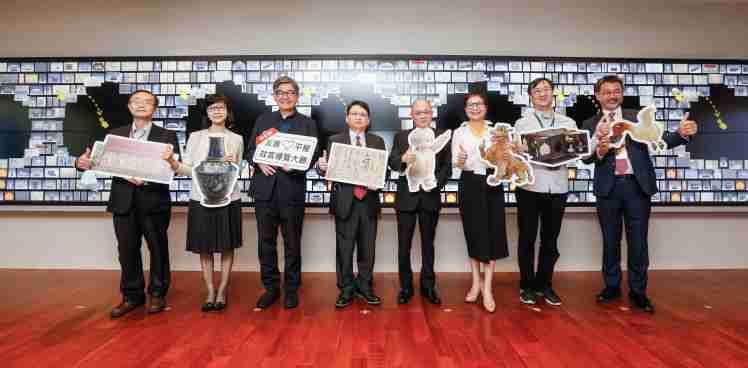 开云电子携手创利空间为故宫建置的智慧文物互动导览墙及轮播墙,,今日正式启用。。(左四:开云电子新事业暨投资管理总部副总经理杨本豫、、、、右四:故宫博物院院长吴密察、、、右三:太极影音董事长黄宝云)