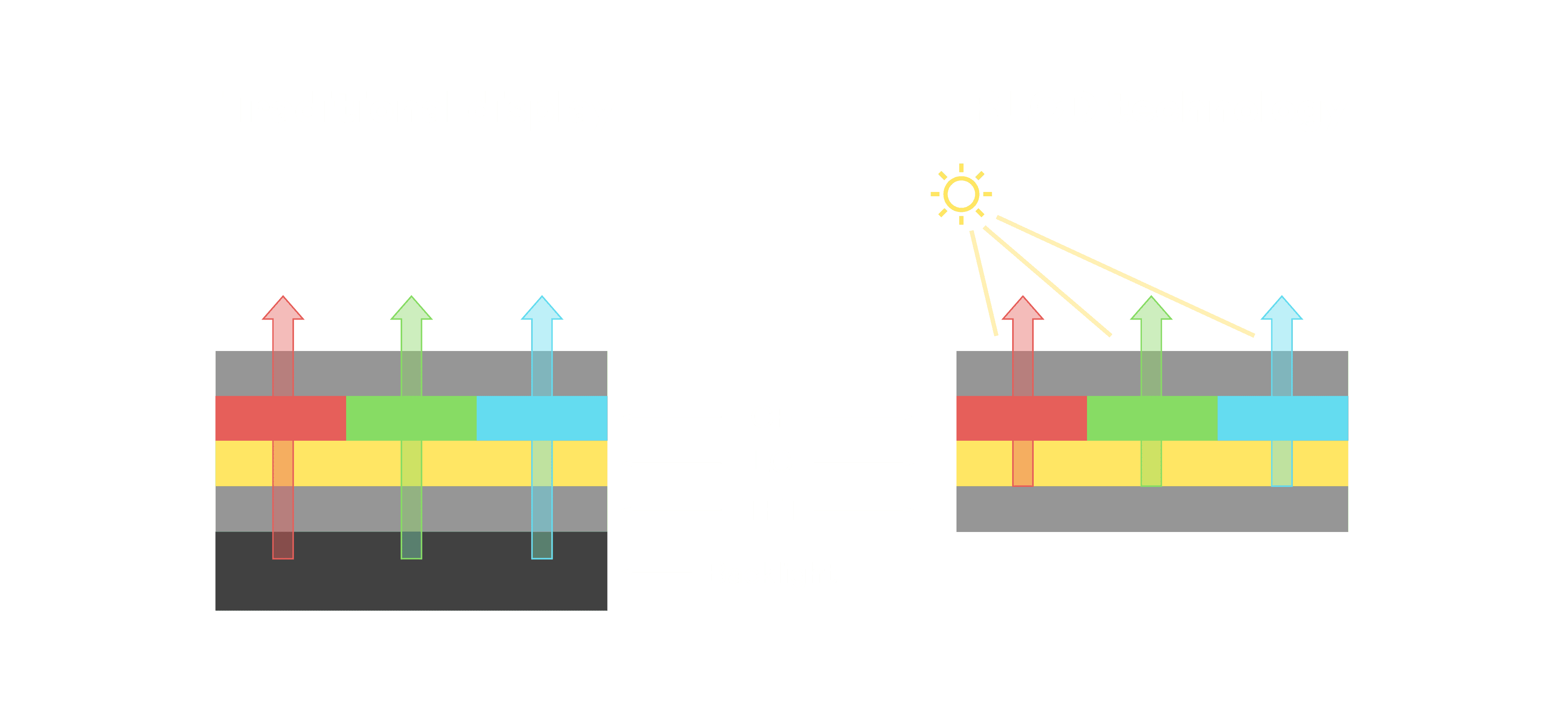 与传统需搭配背光单元的液晶显示相比,,反射式液晶技术不仅更省电、、、更轻薄,,,,且即便在艳阳下仍能清晰显示。。。此外,,,少了背光单元,,,也大幅降低了 LED 蓝光伤害眼睛的疑虑。。