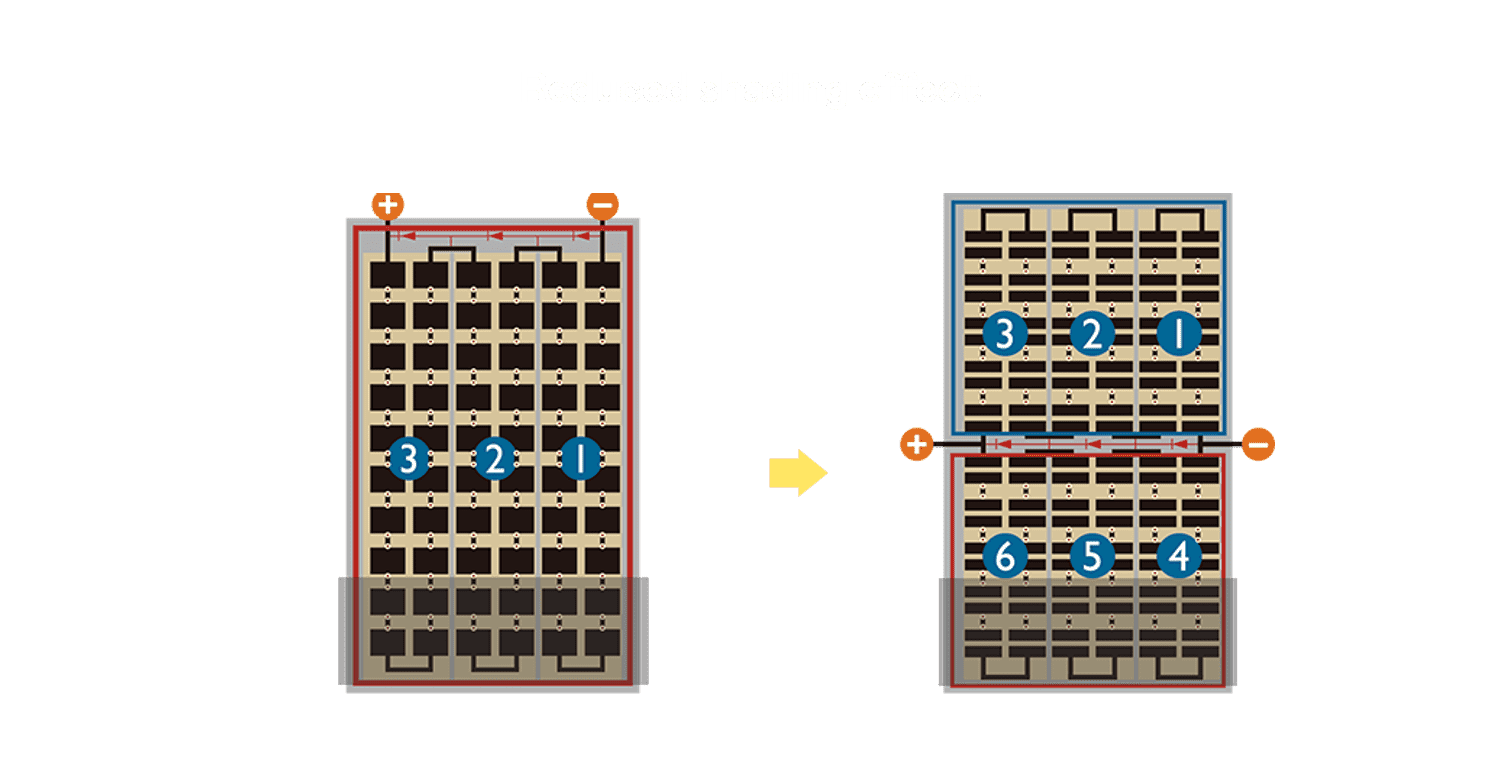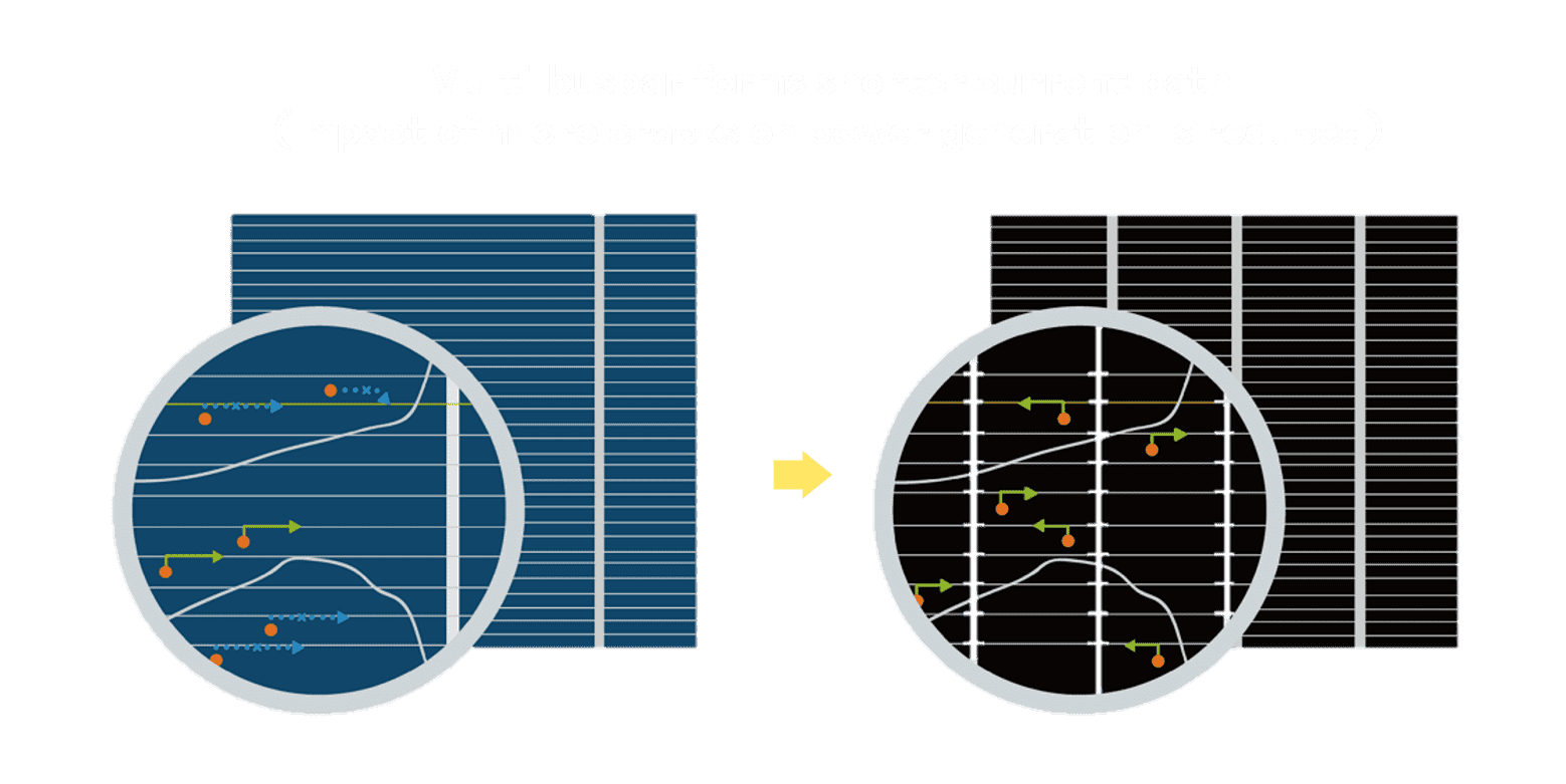 - 电池使用多条铜导线 (Copper wire) 于电池片上形成较短的电流路径,,,,提高电流收集效率,,,采用圆形设计的铜导线较传统扁平式的铜焊带 (Ribbon),,,,可增加入射至电池的光线量。。。